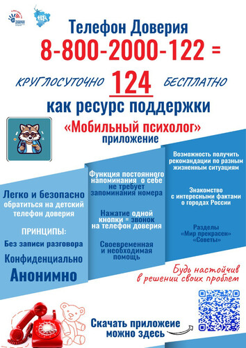 В любой момент нашей жизни может потребоваться психологическая помощь. Дети и их родители могут позвонить на бесплатный круглосуточный телефон доверия 8-800-2000-122 или 124. По этому телефону можно получить консультацию, совет как поступить в той или иной ситуации при возникающем конфликте в семье, между сверстниками, проблеме родителей и детей. На звонки отвечают опытные психологи, прошедшие специализированное обучение.